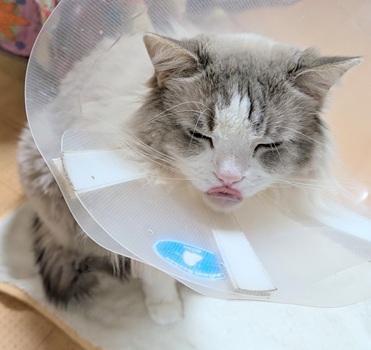 ケア後、エリザベスカラーから解放され毛繕いをし、