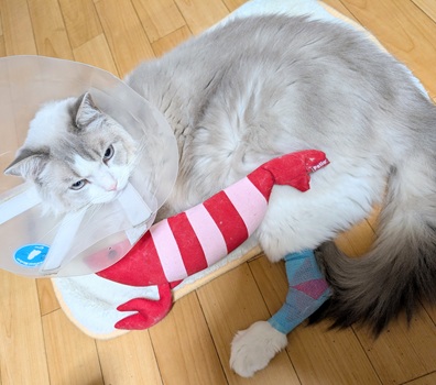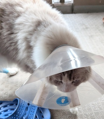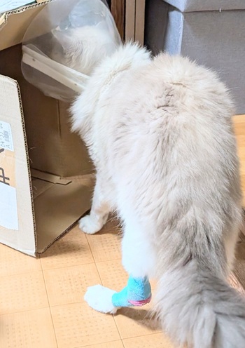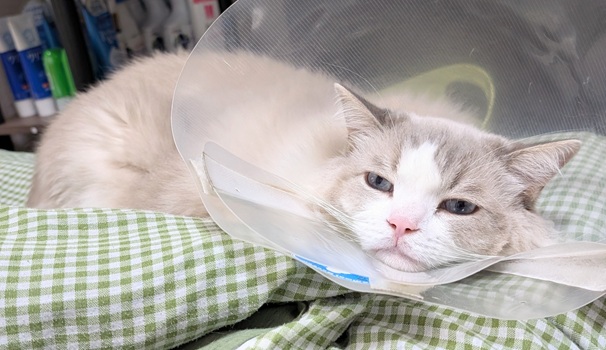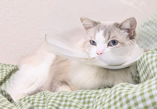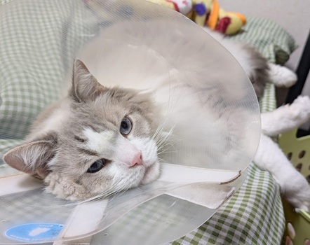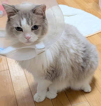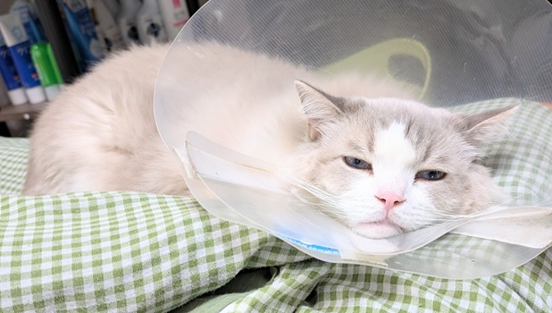 ケア後、エリザベスカラーを外した時に急ぎで毛繕いを頑張ります。