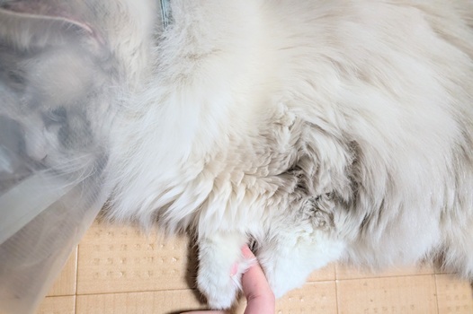 そんな冷たい指を肉球に置くなと言わんばかりに