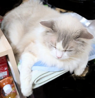 世話係に足を乗せられてもめげずに布団にいてくれます。笑