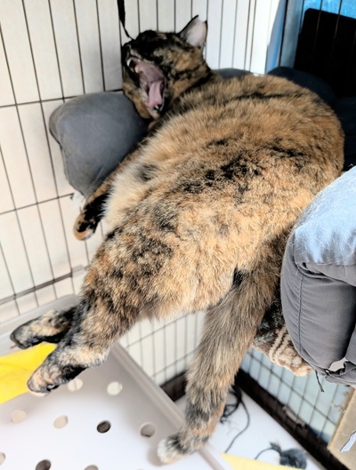 ダラダラ変な寝姿で大あくびのらびちゃん😊
